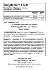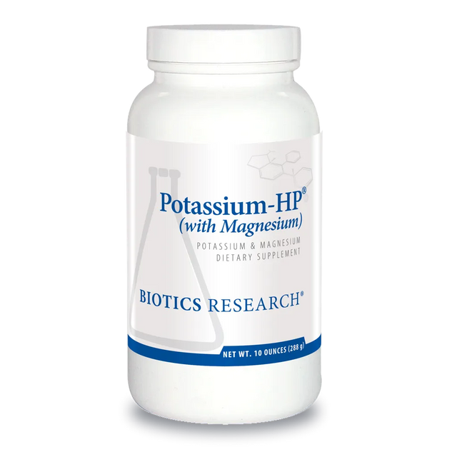 Potassium-HP is a high potency potassium supplement with magnesium. Each teaspoon serving supplies 1,200 mg of elemental Potassium (as potassium citrate) and 120 mg of elemental Magnesium (as magnesium citrate malate).