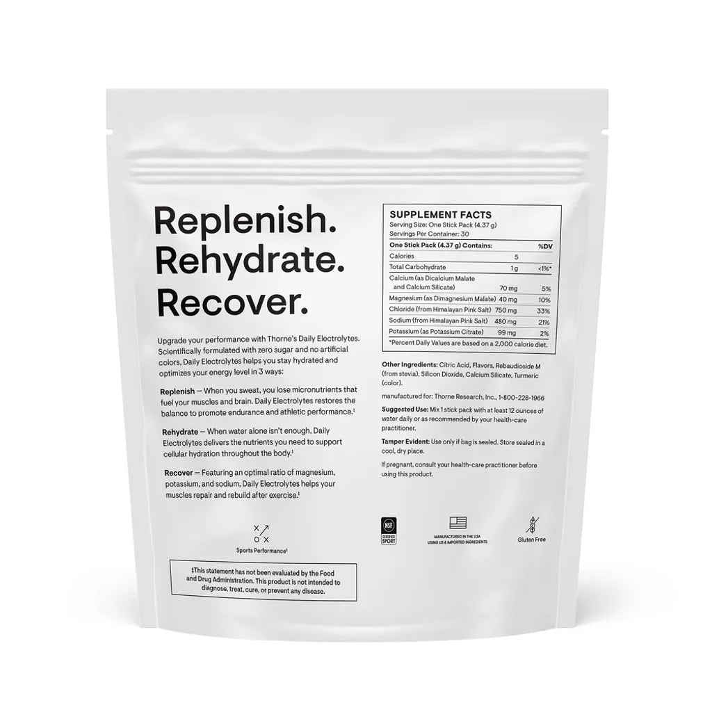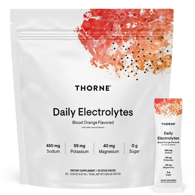 Promote healthy cellular hydration and boost recovery with Thorne’s Daily Electrolytes. Optimal cellular hydration and electrolyte balance supports cellular energy production, benefits cell signaling, and enhances muscle performance, helping you reach new heights, one sip at a time.* Because the body loses water and essential minerals through sweat – including sodium, potassium, magnesium, calcium, and chloride – replenishing those nutrients that are lost is an essential step to think, perform, and feel your best.