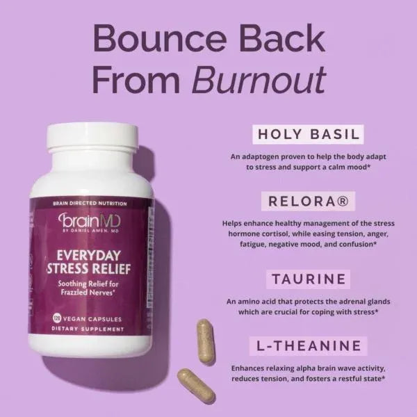 Specifically designed for today's stressed-out individual, Everyday Stress Relief provides a unique blend of natural ingredients at levels clinically proven to help reduce stress, restore calm and manage occasional anxiety without causing sleepiness. Formulated by clinical neuroscientist, board-certified psychiatrist and brain imaging expert Dr. Daniel Amen, Everyday Stress Relief helps mind and body cope with the daily challenges of a hectic life.
