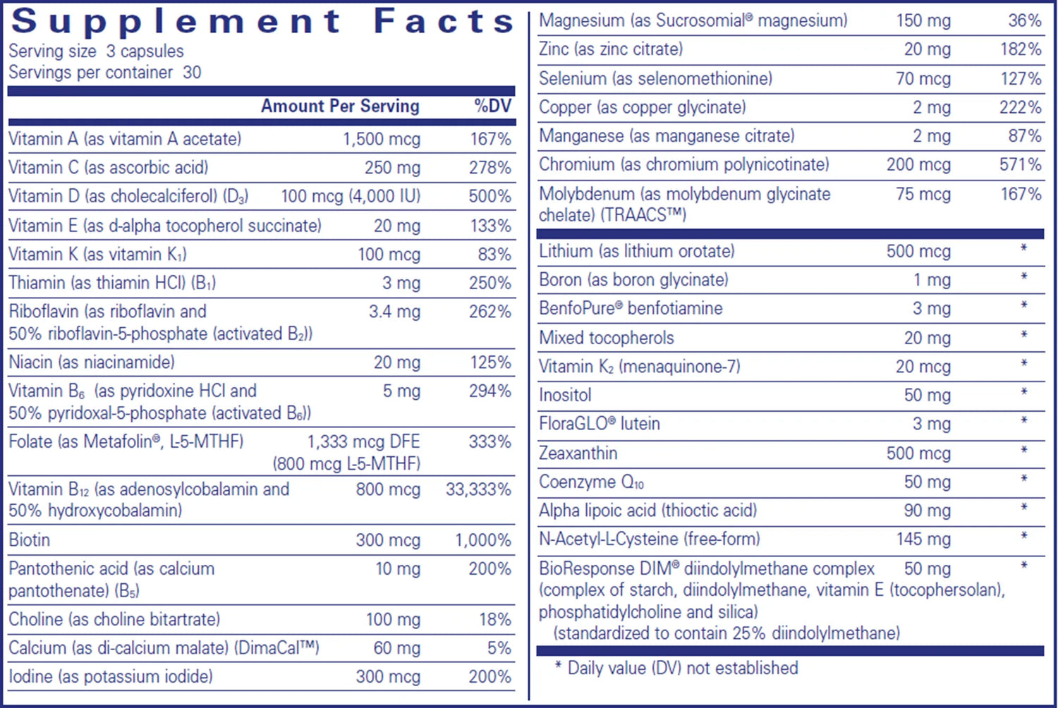 3-per-day comprehensive, high-potency multivitamin/mineral targeting common genetic polymorphisms.
