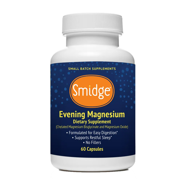 Smidge® Evening Magnesium (formerly Good Night Maggie™) is a gentle, calming supplement made with magnesium glycinate complex (glycinate/oxide) to support restful sleep. Take one capsule in the evening to wind your day down and wake up feeling refreshed and energized, all while fulfilling your body's need for premium magnesium. Gives you the most highly concentrated magnesium oxide in chelated form as magnesium bisglycinate chelate, which is easier to digest and absorb than magnesium oxide alone. 100 mg per capsule.