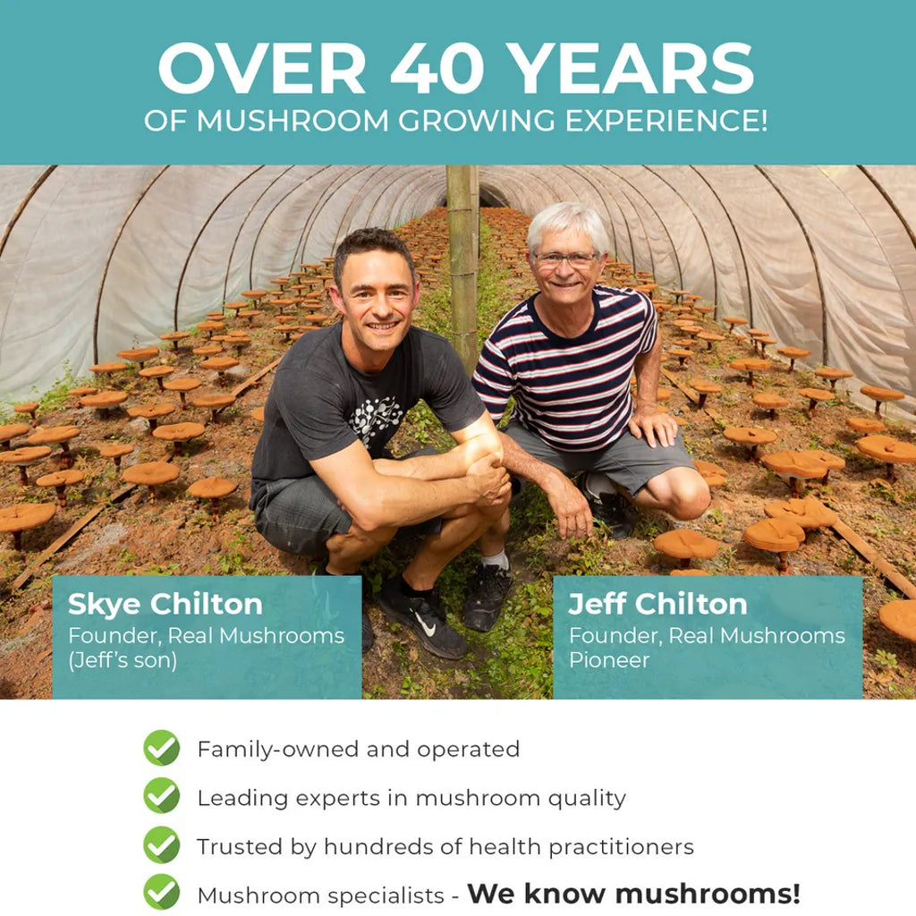 A unique blend of 5 immune enhancing mushrooms (fruiting bodies): reishi, chaga, shiitake, maitake and turkey tail. All mushrooms come from certified organic sources and are extracted to improve bioavailability of the active compounds like beta-glucans. Verified beta-glucans and guarded against grain fillers. Real Mushrooms has over 40 years of mushroom growing experience and is trusted by thousands of health practitioners.