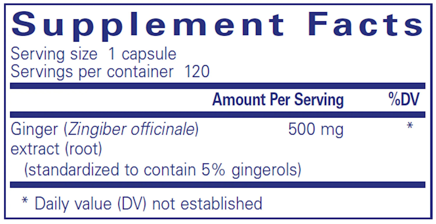 | Ginger (Zingiber officinale) extract (root) (standardized to contain 5% gingerols) | 500 mg |