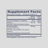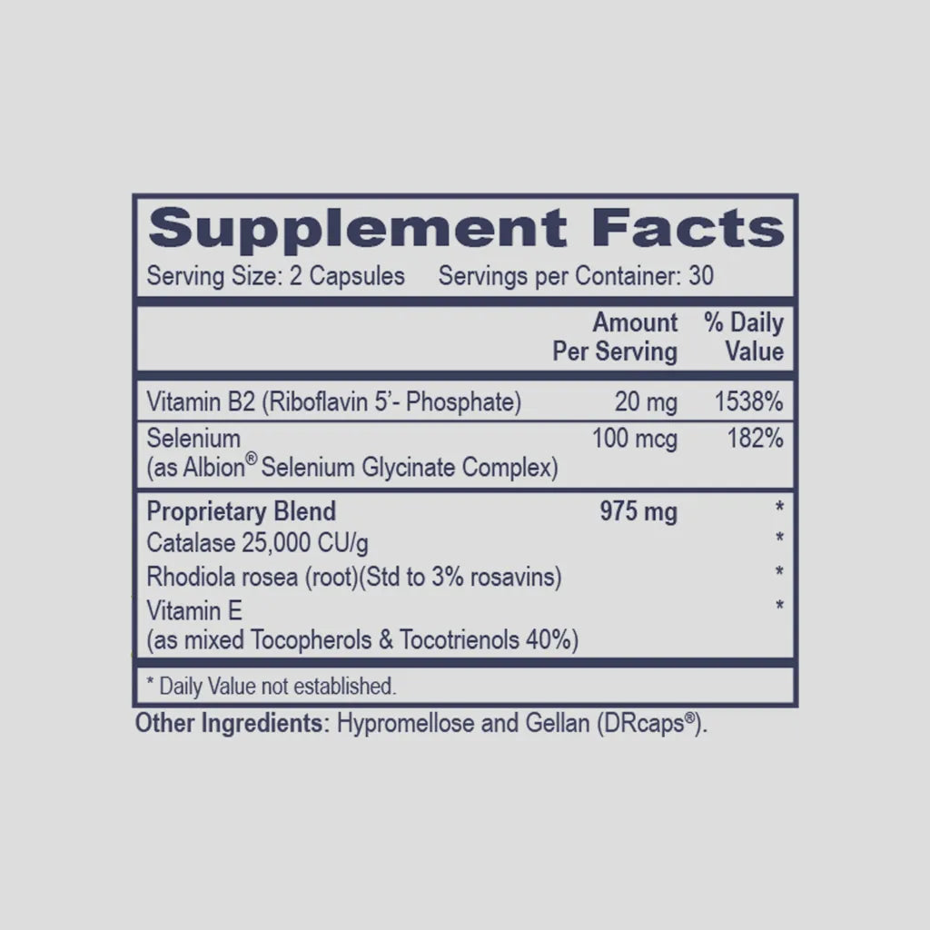 Catalase 25,000 CU/gRhodiola Rosea (root) (Std to 3% rosavins)Tocotrienols (30% mixed) (from soy)