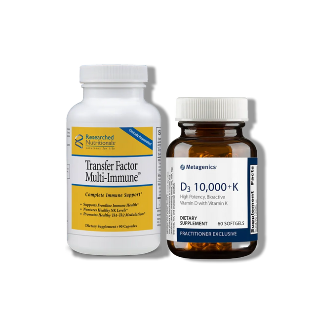 An advanced comprehensive immune support formula, Transfer Factor Multi-Immune promotes healthy natural killer cells, macrophage, T-cells, and cell division. D3 10,000 + K, a high potency bio-active form of vitamin D, aides nearly every aspect of your body's natural defenses and immune fortification.