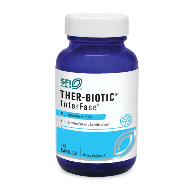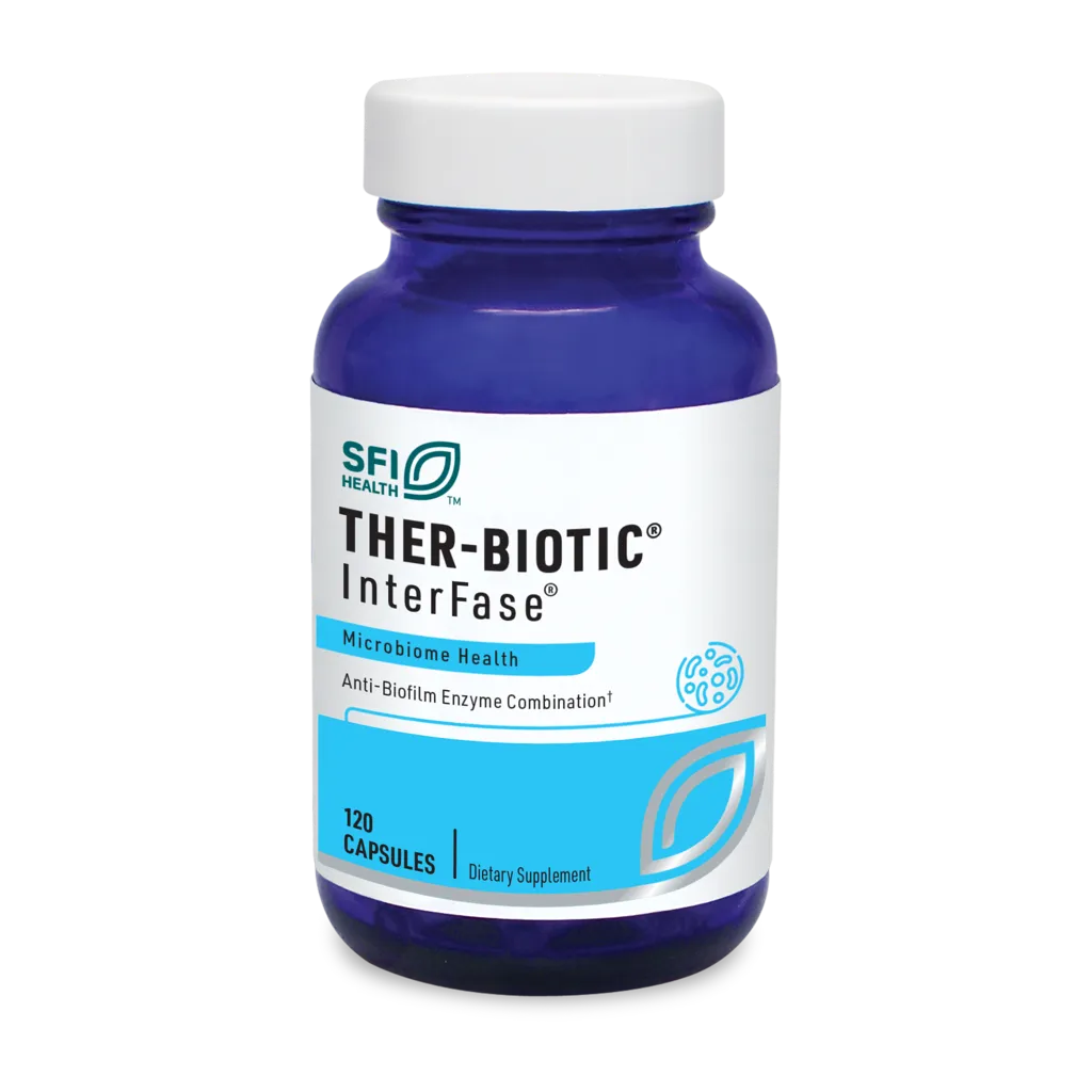 Enzyme combination disrupts biofilm matrix and encourages healthy intestinal microbial communities. InterFase is a unique enzyme formulation that is especially designed to disrupt the biofilm matrix that embeds gastrointestinal organisms. Enzymes in InterFase are selected for their ability to lyse the extracellular polymers commonly found in biofilm as well as degrade bacterial and yeast cell wall structures. The enzyme blend in InterFase® was developed using in vitro testing of antibiofilm activity and was found to have significant antibiofilm activity resulting in meaningful degradation of undesirable biofilm communities. InterFase® is intended for use in conjunction with efforts to support normal gastrointestinal function and microbiota. As an adjunct, it is best combined with use of a high-strength, broad-spectrum, multispecies probiotic formulation and a prebiotic to encourage the formation of healthy intestinal microbial biofilm communities.