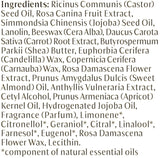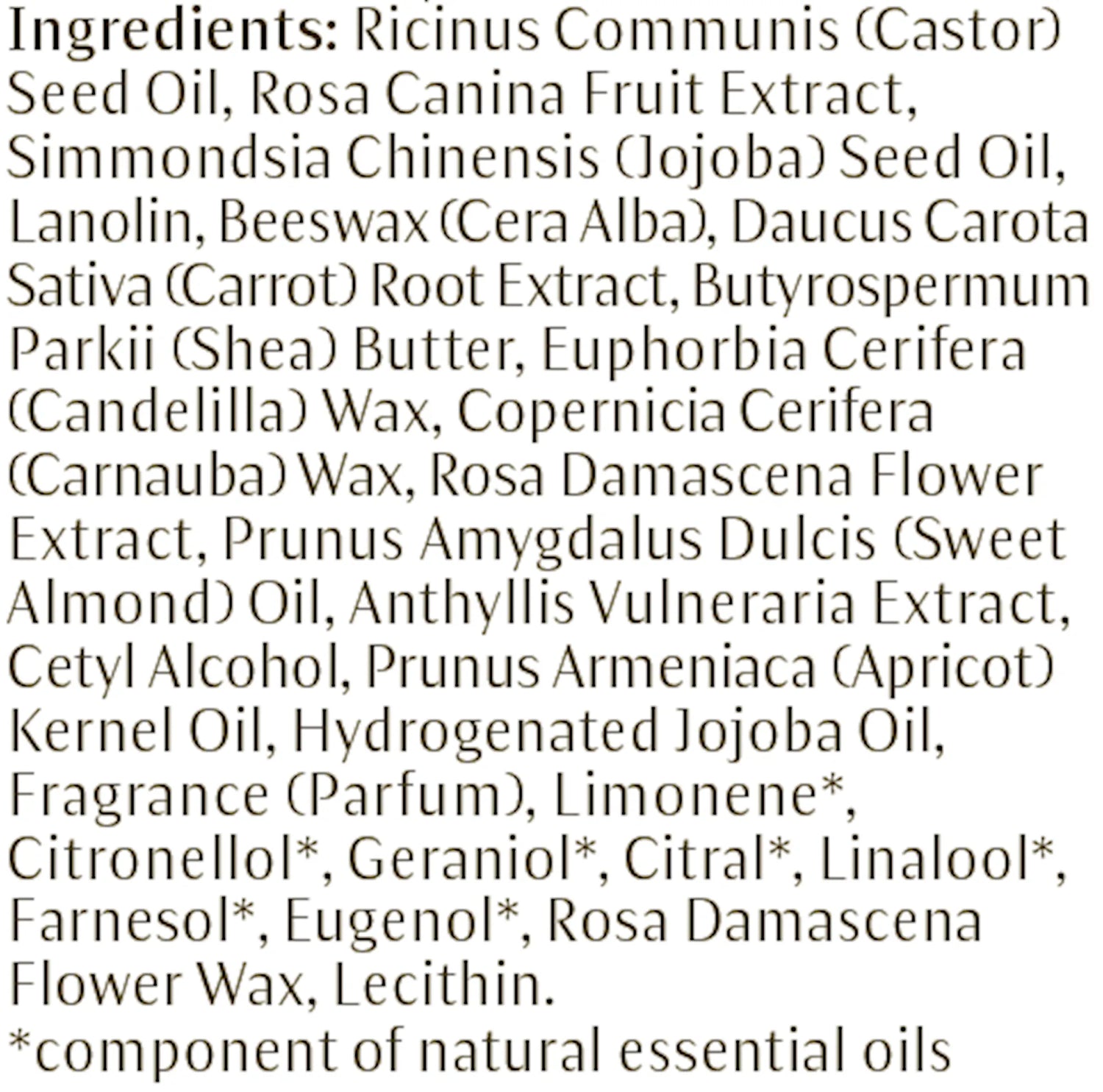 Ingredients: Ricinus Communis (Castor) Seed Oil, Rosa Canina Fruit Extract, Simmondsia Chinensis (Jojoba) Seed Oil, Lanolin, Beeswax (Cera Alba), Daucus Carota Sativa (Carrot) Root Extract, Butyrospermum Parkii (Shea) Butter, Euphorbia Cerifera (Candelilla) Wax, Copernicia Cerifera (Carnauba) Wax, Rosa Damascena Flower Extract, Prunus Amygdalus Dulcis (Sweet Almond) Oil, Anthyllis Vulneraria Extract, Cetyl Alcohol, Prunus Armeniaca (Apricot) Kernel Oil, Hydrogenated Jojoba Oil, Fragrance (Parfum), Limonene*, Citronellol*, Geraniol*, Citral*, Linalool*, Farnesol*, Eugenol*, Rosa Damascena Flower Wax, Lecithin.