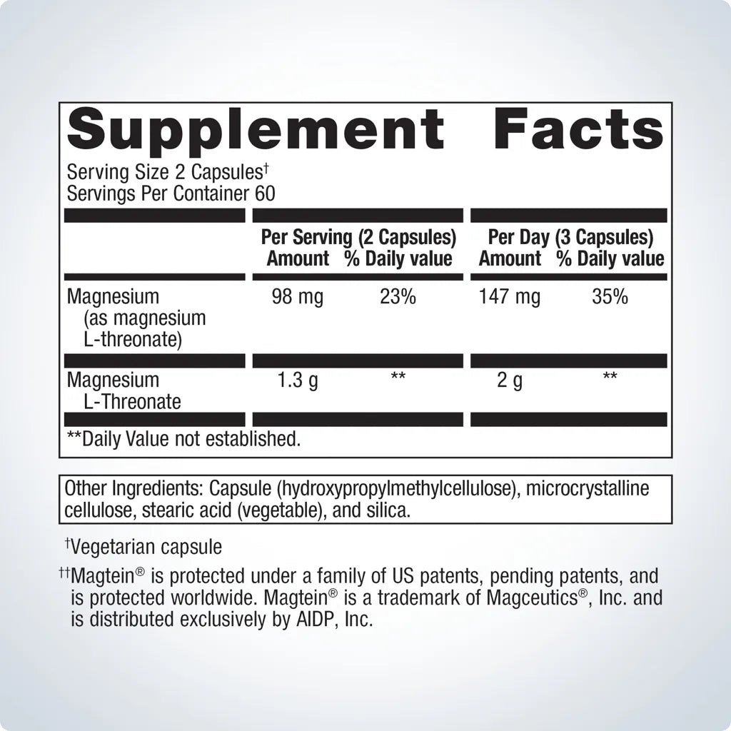 Mag L-Threonate features magnesium L-threonate as Magtein®, designed to help support cognitive health. Magnesium, a divalent cation, is important for neuronal activity as it binds to neurotransmitter receptors and is a co-factor for neuronal enzymes.*