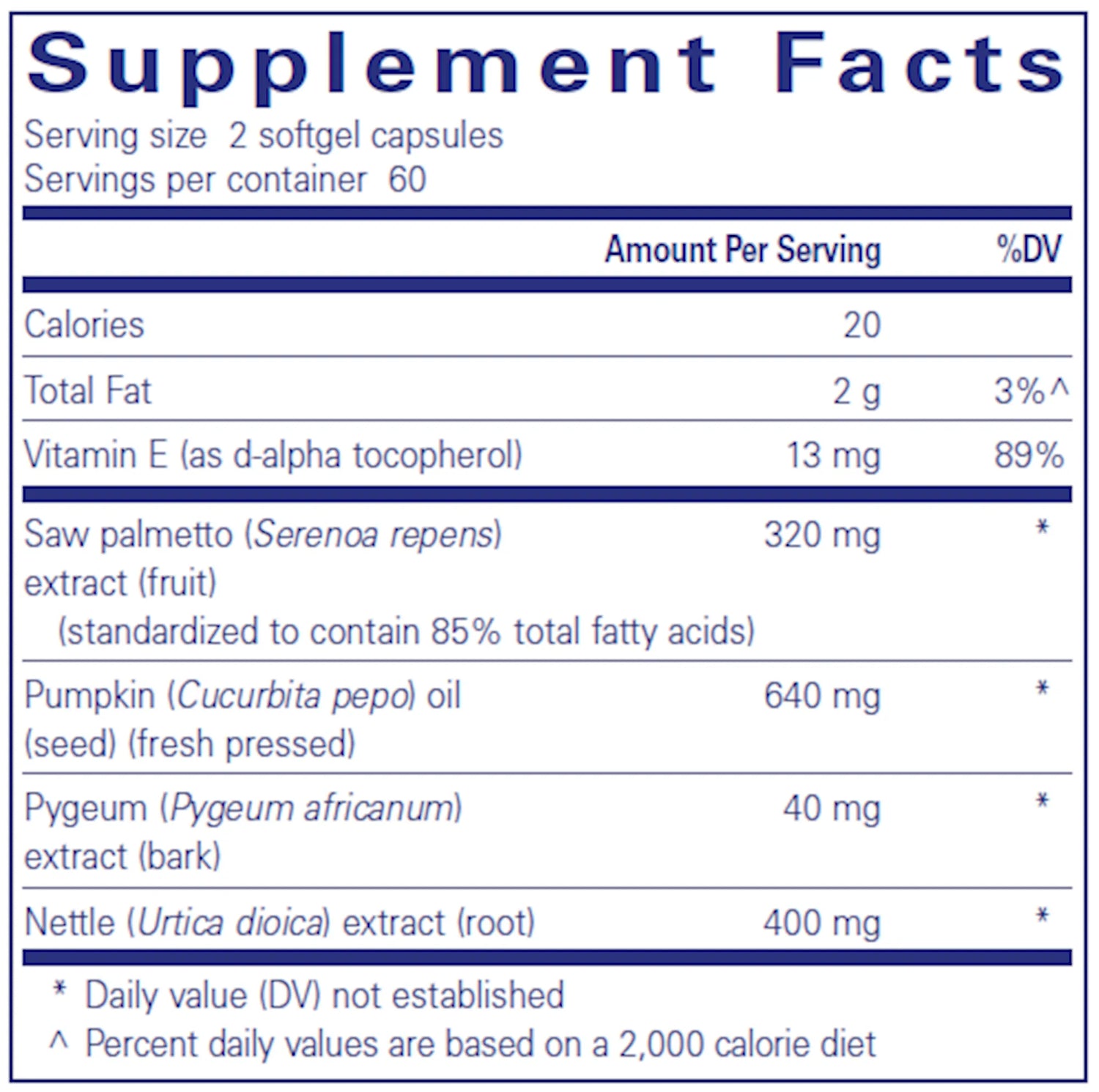 Saw palmetto has been used safely for decades to support proper prostate and urinary function. Its primary mode of action involves maintaining healthy testosterone metabolism. In a recently published JAMA meta-analysis involving 18 randomized controlled trials and almost 3,000 men, saw palmetto promoted healthy urinary flow. Pygeum africanum may maintain healthy prostaglandin and prolactin metabolism in the prostate. Pumpkin seed oil provides essential fatty acids and zinc, important for prostate health.